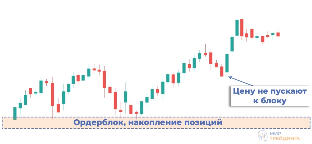 Ордерблок (Order Block, блок заказов) — область на ценовом графике, в которой расположены крупные заявки на покупку или продажу. Например, для того чтобы крупный игрок мог закупить актив на большую сумму и при этом не запампить цену, он выставляет лимитные ордера на покупку в определенной ценовой зоне. Следовательно он равномерно накапливает позицию в активе по одной цене. Данная область может выступать в качестве сильного уровня поддержки, от которого будет отталкиваться цена.