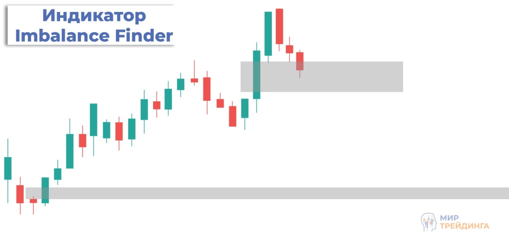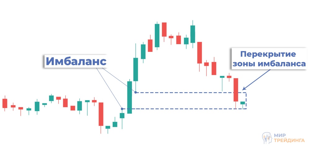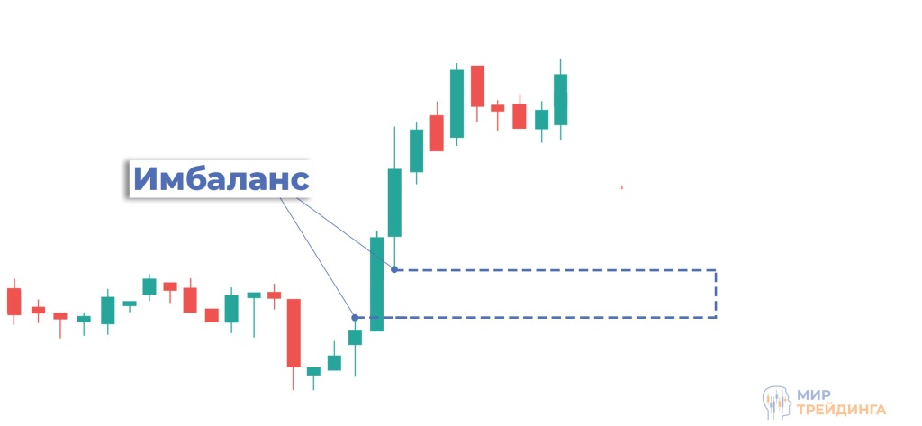 Имбаланс (FVG) — это преимущество одной из сторон на рынке, которое выражается в виде быстрого, импульсного движения цены. Имбаланс возникает из-за значительного перевеса ордеров покупки или продажи. На ценовом графике его можно отметить как область, высота которой формируется из трех свечей. Импульсная свеча находится в середине, от тени первой свечи до тени третьей отмечается высота зоны имбаланса.