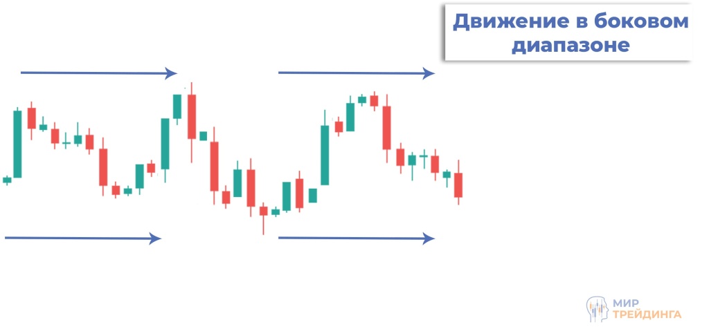 Боковой тренд. Стоимость актива движется в определенном горизонтальном диапазоне. Это может свидетельствовать о неопределенности на рынке или накоплению позиций крупным игроком.