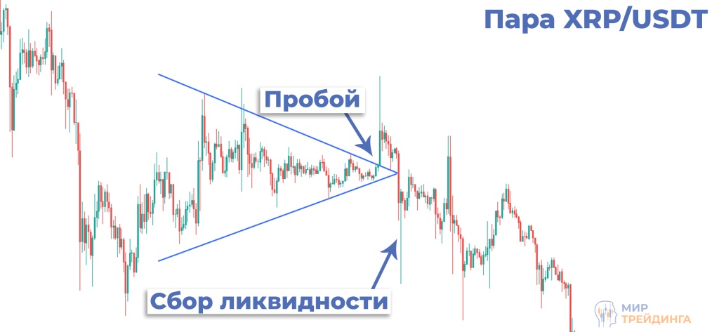 Рассмотрим пару криптовалют XRP/USDT на часовом таймфрейме. На графике есть отчетливый паттерн симметричного треугольника, фигуры неопределенности в техническом анализе. Обычно трейдеры отрабатывают этот паттерн после выхода цены актива за одну из его границ. В данном примере можно наблюдать импульсный пробой верхней границы. Наблюдая это, множество участников рынка открыло длинные позиции со стоп-лосс ордерами на уровне треугольника и под ним. Далее идет резкий разворот и быстрое движение вниз в зону накопленной ликвидности.