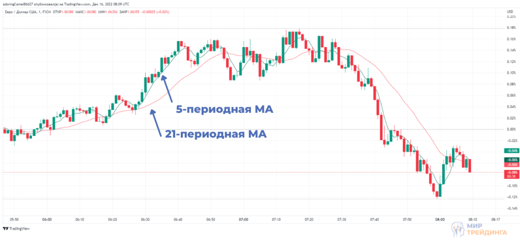Таким образом, мы построили пересечение скользящих средних, где сигналы генерируются когда 5-периодная скользящая средняя пересекает 21-периодную. Теперь длинную позицию можно открывать, когда зеленая линия пересекает красную и уходит выше, а закрывать ее или открывать короткую позицию можно, когда зеленая линия пересекает красную и уходит ниже.