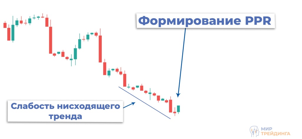 Рассмотрим торговлю на примере бычьего PPR. На ценовом графике видим продолжительный нисходящий тренд, поэтому можно искать технические признаки его слабости. То есть снижение объемов и силы импульсов.