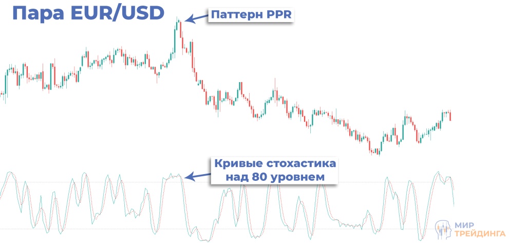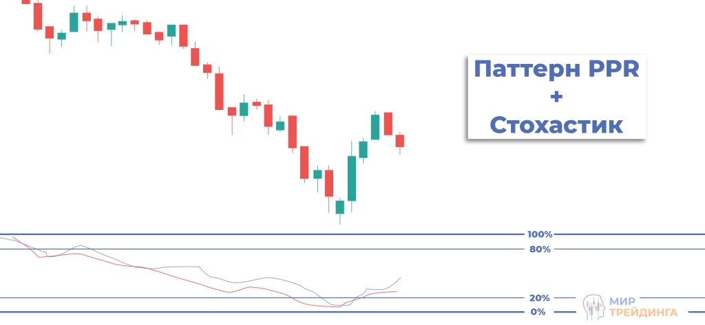 Как и другие разворотные паттерны, сигналы PPR нужно подтверждать и фильтровать техническими индикаторами. Под эту роль хорошо подходят осцилляторы: Стохастик, ATR, RSI, MACD. Рассмотрим в качестве примера комбинацию паттерна PPR и стохастика. Стохастический осциллятор (стохастик) — индикатор технического анализа, который определяет силу или слабость тренда, помогает идентифицировать разворот. Визуализируется в окне под ценовым графиком в виде двух кривых линий: медленная и быстрая. В окне индикатора установлены горизонтальные уровни 80 и 20. Если кривые находятся над 80 уровнем, это сигнализирует о перекупленности актива. И наоборот, если кривые под 20 уровнем, это сигнал перепроданности.
