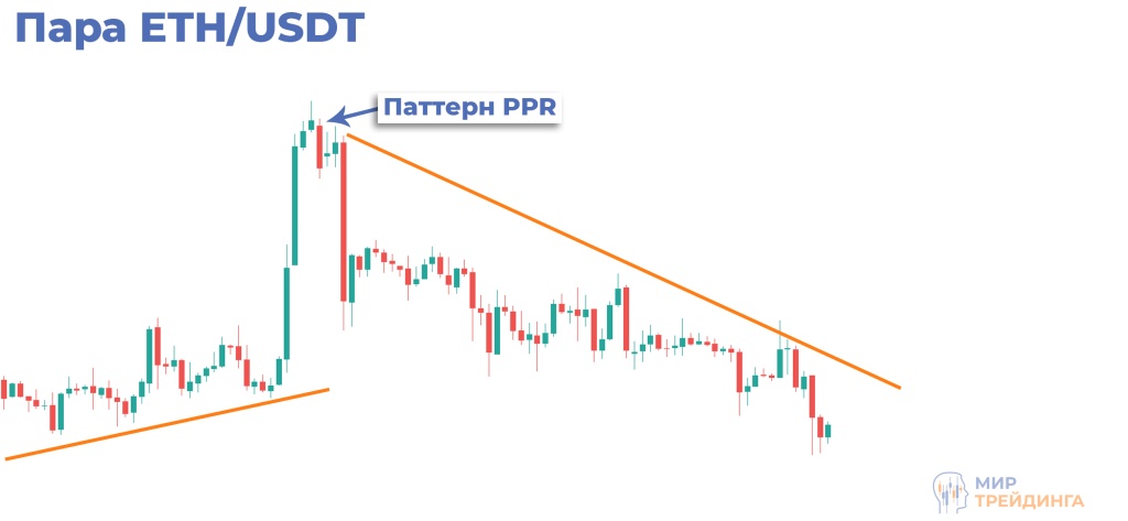 Криптовалютная пара ETH/USDT, четырех часовой таймфрейм. На ценовом графике локальный бычий тренд с импульсным завершением. Во время импульса образовался паттерн PPR, так как стоимость эфириума встретила сильный уровень сопротивления. Далее тренд сменился на нисходящий.