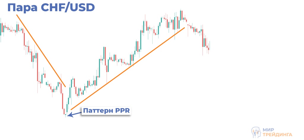 Валютная пара CHF/USD, часовой таймфрейм. На ценовом графике локальный нисходящий тренд. Стоимость швейцарского франка встречает сильный уровень поддержки и формирует паттерн PPR. Преимущество переходит на сторону покупателей и тренд меняется на восходящий.