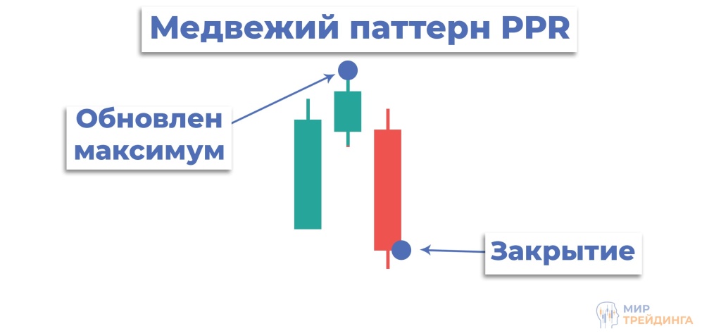 2) Медвежий. При медвежьем паттерне PPR идет смена тренда от бычьего к медвежьему. Первая свеча — бычья, вторая свеча обновляет максимум предыдущей. Третья — медвежья свеча закрывается ниже минимума второй свечи паттерна.