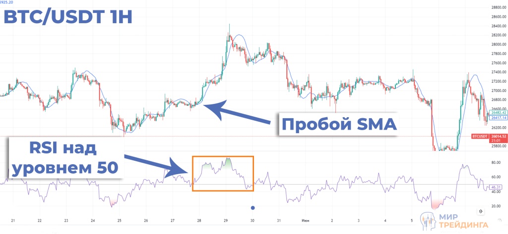 Пара BTC/USDT, часовой таймфрейм. На графике виден пробой скользящей средней. Подтверждением бычьего тренда является кривая RSI, которая находится над уровнем 50 на протяжении всего тренда.
