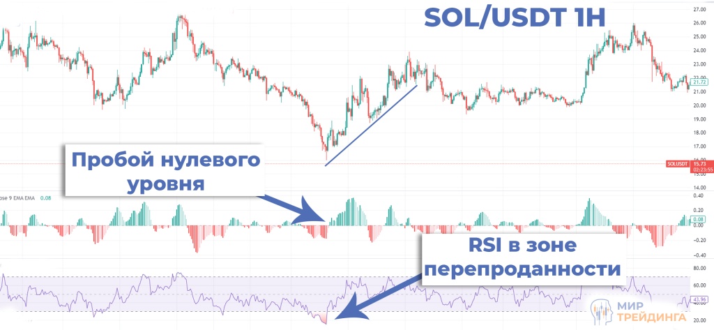 Пара SOL/USDT, часовой таймфрейм. Нисходящий тренд обновил свой минимум и актив оказался в зоне перепроданности по индикатору RSI. Далее можно наблюдать пробой нулевого уровня гистограммой MACD. Это является подтверждением разворота и смены тренда на бычий.