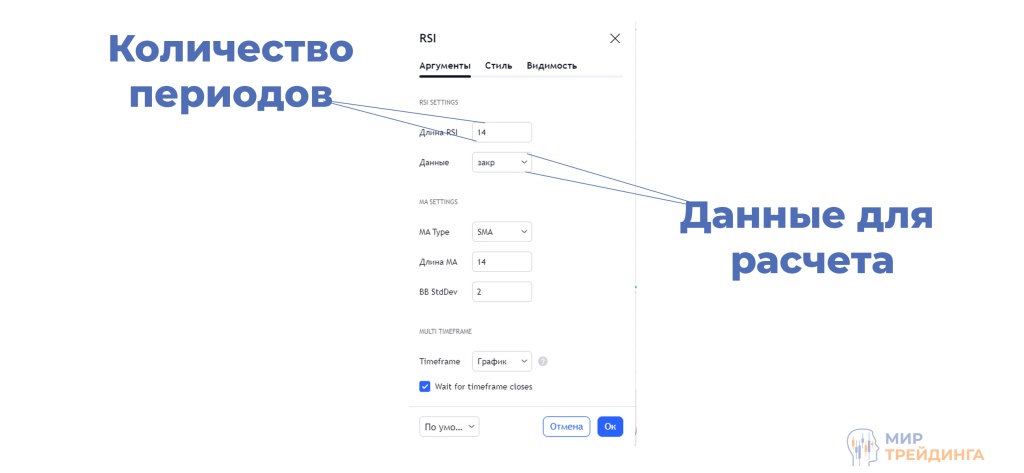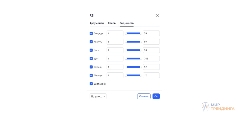 Во вкладке “Видимость” можно выбрать таймфреймы, на которых будет виден индикатор RSI.