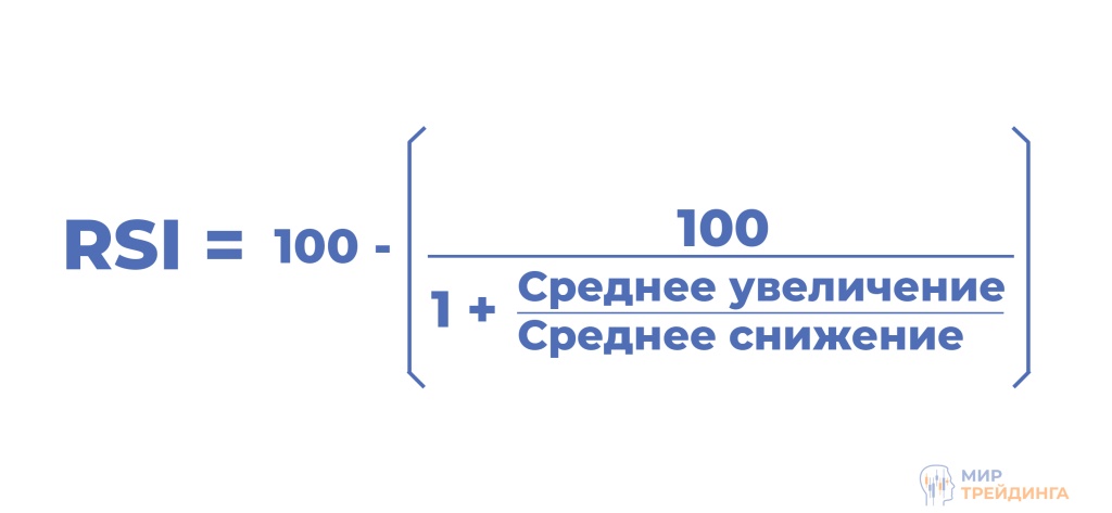 Индикатор имеет достаточно простой метод расчета. По умолчанию RSI измеряет стоимость актива за 14 периодов и вычисляет среднее увеличение/снижение цены. Далее полученные значения интерпретируются в виде кривой линии индикатора. Ниже формула расчета.