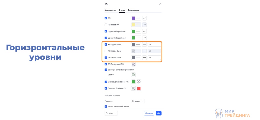 Во вкладке “Стиль” доступны настройки разметки окна индикатора. По умолчанию установлены два горизонтальных уровня (30 и 70). Их используют для идентификации тренда и возможной точки разворота. А помощью горизонтального уровня на значении 50 возможно определить наличие тренда.