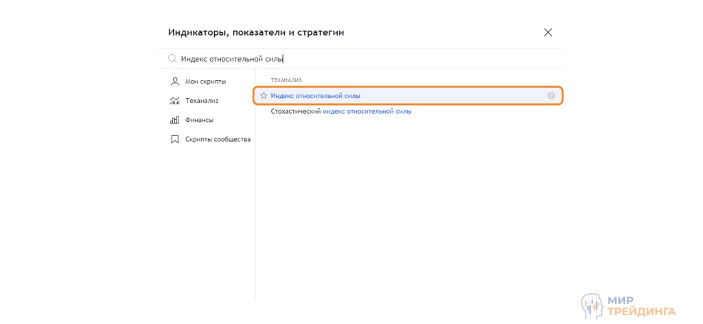 после выбора нужной торговой пары, в верхнем меню нажмите на вкладку “Индикаторы”. В строке поиска введите “Индекс относительной силы” и нажмите на него. Индикатор отобразиться под графиком.
