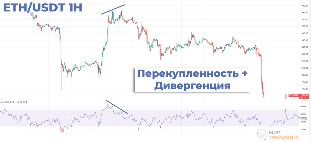 Пара ETH/USDT, часовой таймфрейм. Сильный сетап, комбинация дивергенции и зоны перепроданности. Бычий тренд сменился на медвежий.