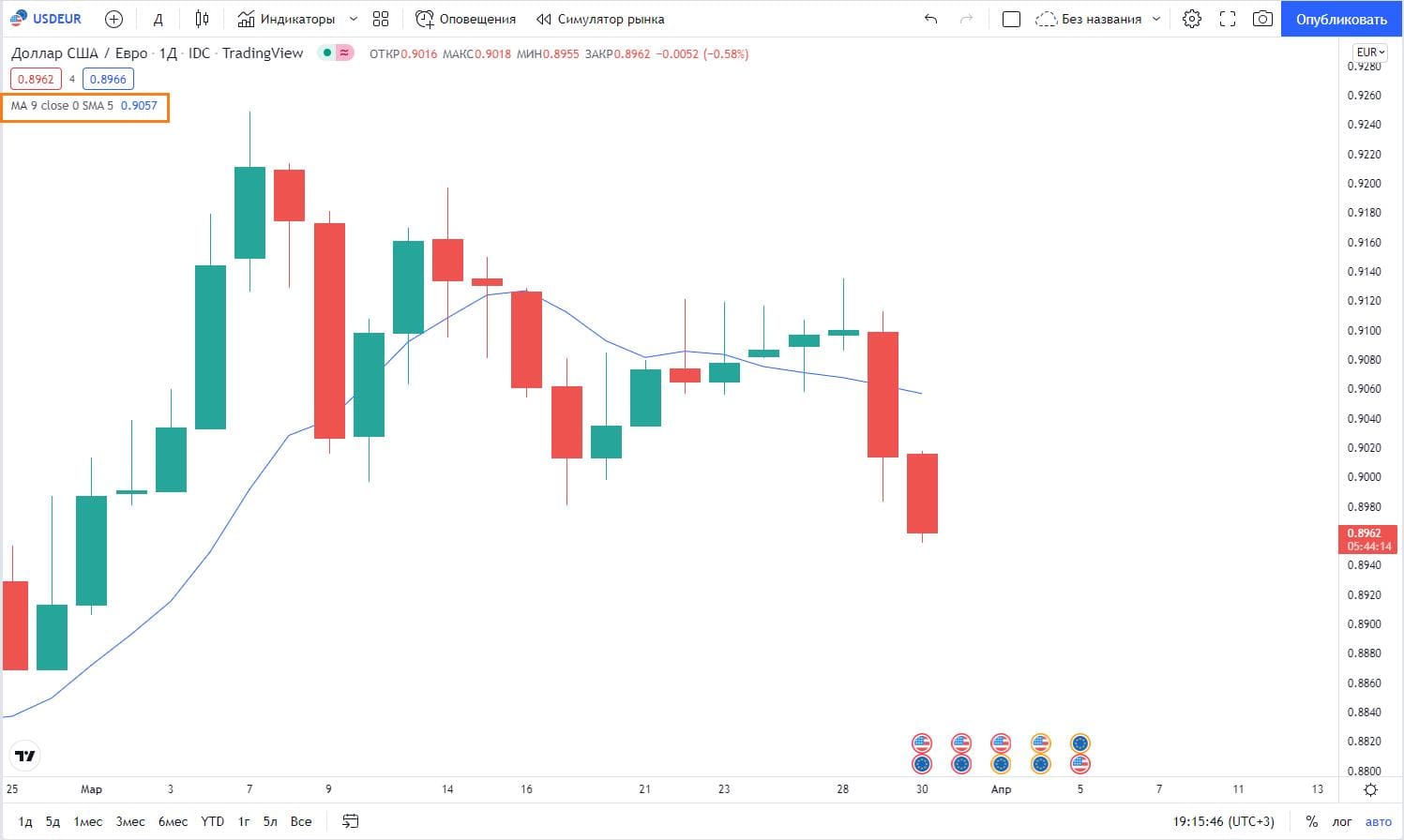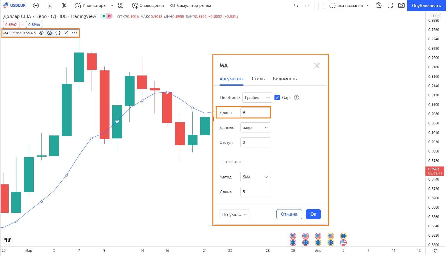 - На графике отобразится MA (Moving Average) c длиной 9 (период формирования – 9 свечей).