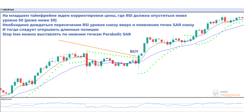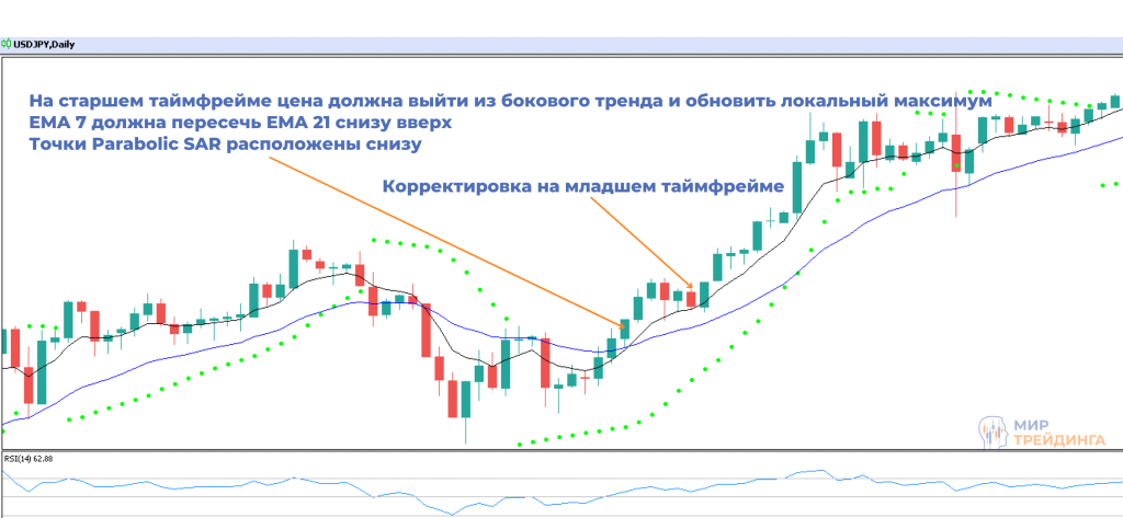 Правила для покупки: на старшем таймфрейме цена выходит из бокового тренда и обновляет локальный максимум, EMA 7 (черная) пересекает EMA 21 (синяя) снизу вверх. При этом точки Parabolic SAR находятся под ценой. На младшем таймфрейме ждем корректировки цены, где RSI должна опуститься ниже уровня 50 (реже 30). При этом точки Parabolic SAR находятся снизу. После этого можно открывать сделку на покупку. Также точки Parabolic SAR могут служить уровнем stop loss.