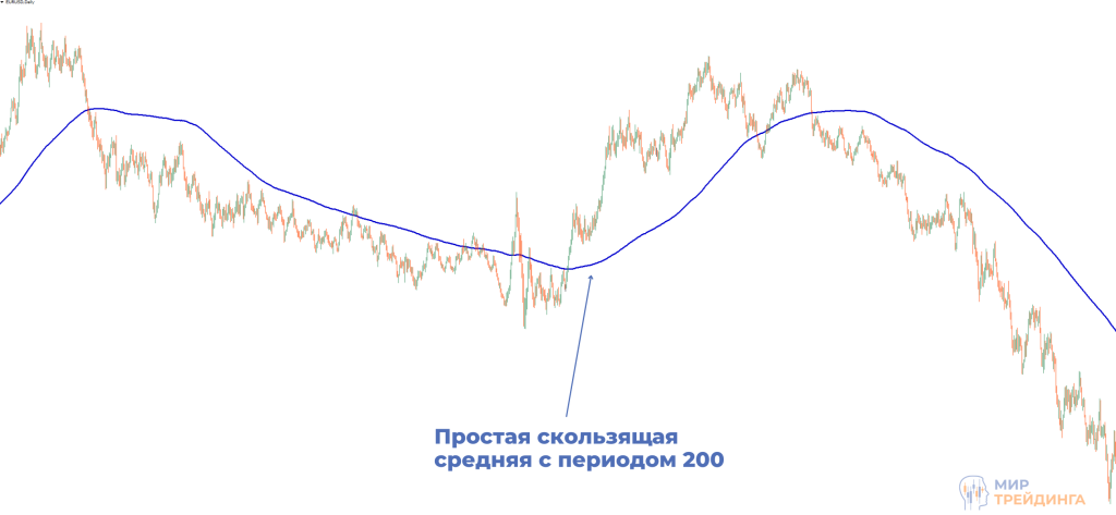 Это очень важный момент, который необходимо учитывать. Слишком длинный период приведет к запаздываниям сигналов, а слишком короткий провоцирует появление ложных. Для каждого торгового инструмента и таймфрейма необходимо подбирать оптимальные значения. К сожалению, универсального решения нет и трейдер должен выявлять такие значения самостоятельно. Так происходит из-за того, что рынок постоянно меняется, находится в разных состояниях. Единственное, что можно выделить, так это индикатор 200 скользящая средняя. Название говорит само за себя, это мувинг с большим периодом 200, который чаще всего используют на дневном периоде. Также популярны МА100 и МА150. Но, повторим, это актуально для крупных фреймов.