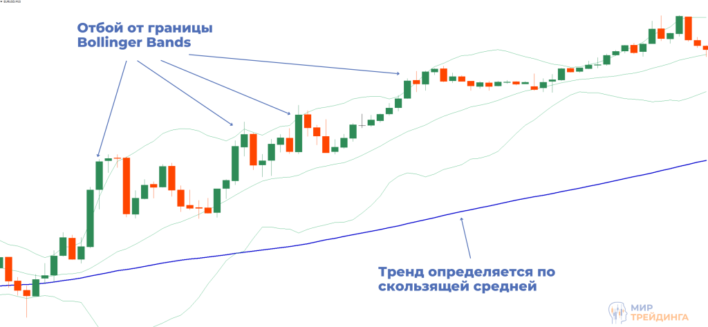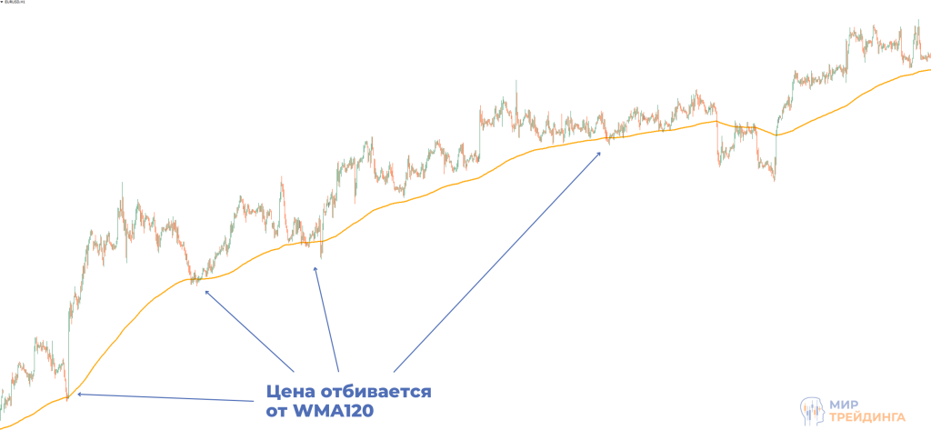 Распространенный прием в трейдинге. Если внимательно подойти к вопросу, то можно подобрать такой период, что скользящая средняя станет опорой для тренда. У нас получается динамическое сопротивление или поддержка. Коррекции будут заканчиваться либо на самой линии, либо в области около нее. Это очень удобно для реализации торговли пирамидой, когда на каждой такой коррекции трейдер добавляет объем. Предыдущие ордера, открытые по такой системе, переводятся в безубыток. После того, как цена пробивает такую скользящую среднюю, можно выходить из позиций, тренд считается сломленным в рамках работы с МА.