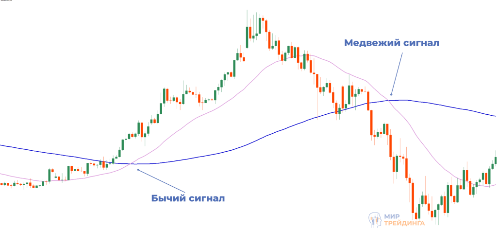 Простейший сигнал, который можно назвать самым распространенным в рамках торговли и применения МА.