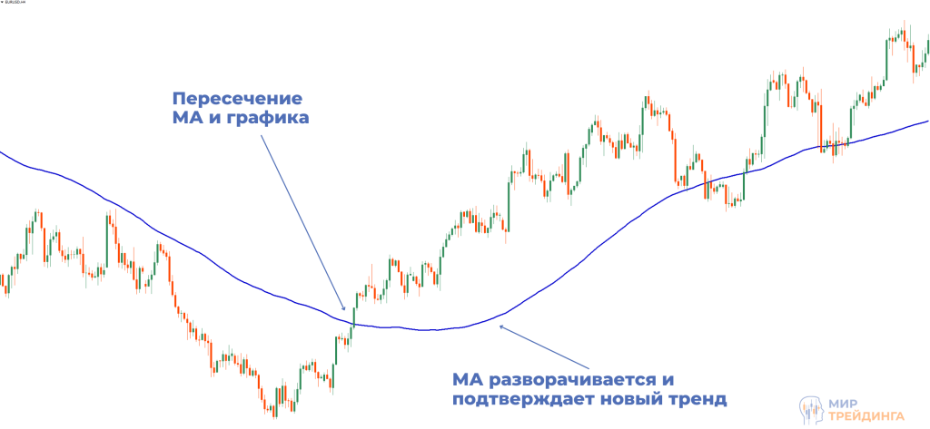 Пересечения скользящей средней с графиком или же нескольких МА с разными периодами можно рассматривать как сигналы для открытия позиции. Поскольку мувинг использует усреднение, он всегда отстает от цены в рамках тренда. Но если он пересекается с графиком, можно ожидать смену тренда. По такому же принципу действует и пересечение самих МА. Меньший период предполагает меньшую удаленность от графика, дополнительным сигналом будет пересечение медленной МА.