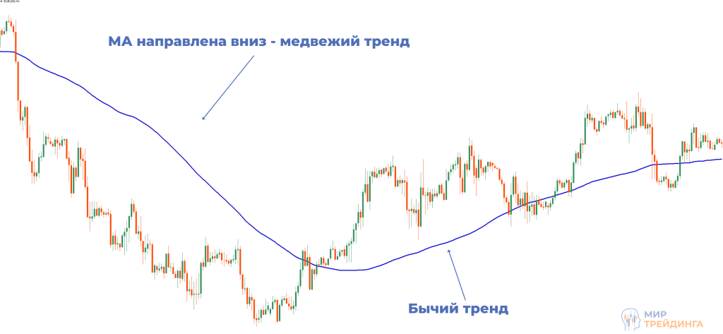 линия МА поднимается вверх, это сигнализирует о бычьем тренде на данный момент;