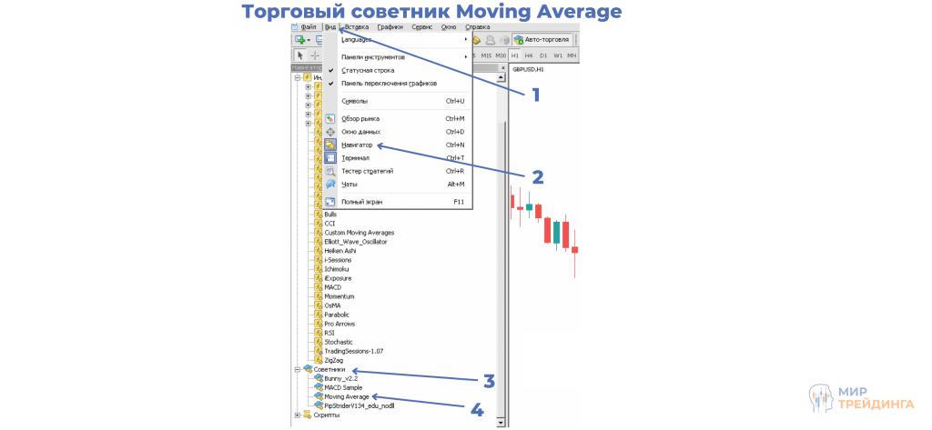 Советник Moving average, в отличие от большинства других, включен в список стандартных торгового терминала Metatrader. Но если робота по каким-либо причинам нет или dы просто случайно удалили, то его можно без проблем скачать бесплатно из интернета. Чтобы включить советник в MT, нужно перейти в верхнем меню: Вид 一 Навигатор 一 Советники 一 Moving Average (нужно перенести с зажатой левой кнопкой мыши на график или просто использовать двойное нажатие). Также необходимо разрешить автоматическую торговлю. Для этой цели переходим: Сервис 一 Настройки 一 Советники. Ставим галочки на разрешение автоматической торговли и импорт DLL.