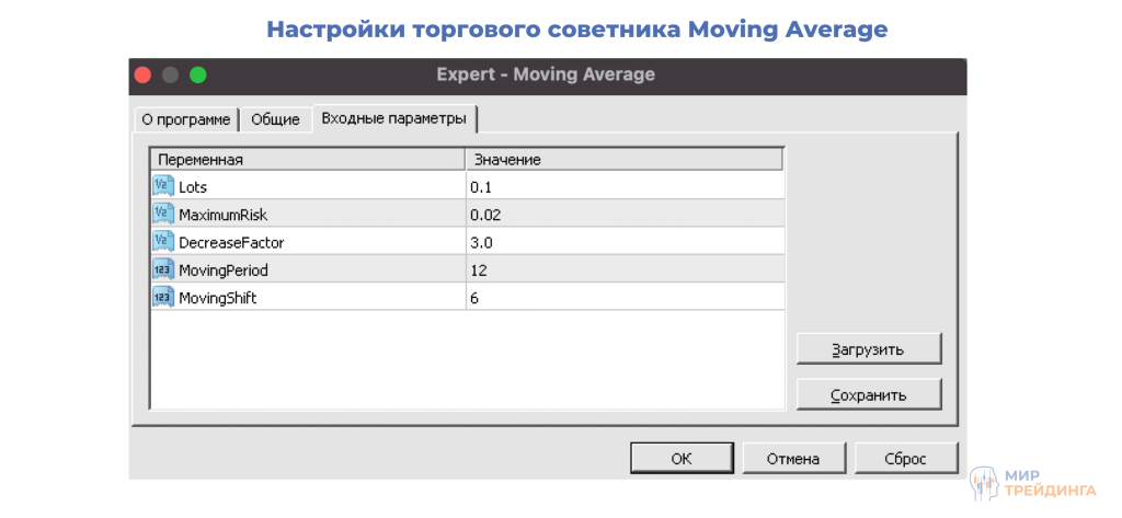Как понятно из названия, принцип работы советника основан на анализе движения скользящей средней. Стратегия очень простая. Советник открывает длинную позицию, если цена пересекает Moving average снизу вверх. И в случае пересечения ценой скользящей средней сверху вниз открывается короткая позиция.