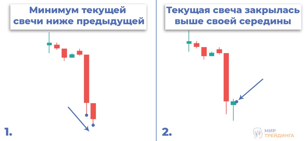 Разберем пошагово, как данный паттерн будет выглядеть на привычных японских свечах. После открытия свечи, которая потенциально будет являться разворотным бычьим баром, она должна обновить минимум. Который будет ниже, чем минимум предыдущей свечи. Затем покупатели начинают доминировать над продавцами, и свеча закрывается выше своей середины. Это и будет сигнализировать о том, что разворотный бычий бар сформировался.