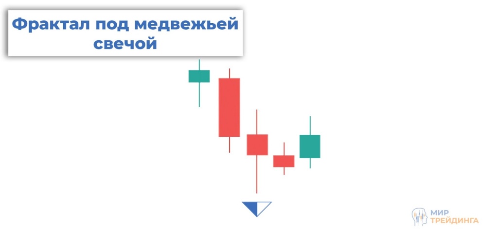 2) Фракталы Билла Вильямса — индикатор, который определяет потенциальные точки разворота рынка, выделяя минимумы и максимумы. Фракталы представляют собой стрелки вверх либо вниз, расположенные над бычьими свечами и под медвежьими. Фрактал формируется минимум из пяти свечей. Если идет речь о фрактале над бычьей свечей, то он устанавливается над максимумом третьей при условии, что две предыдущие имеют меньшие значения максимумов. И наоборот, при фрактале под медвежьей свечой должны соблюдаться точно такие же правила, но с минимумами.