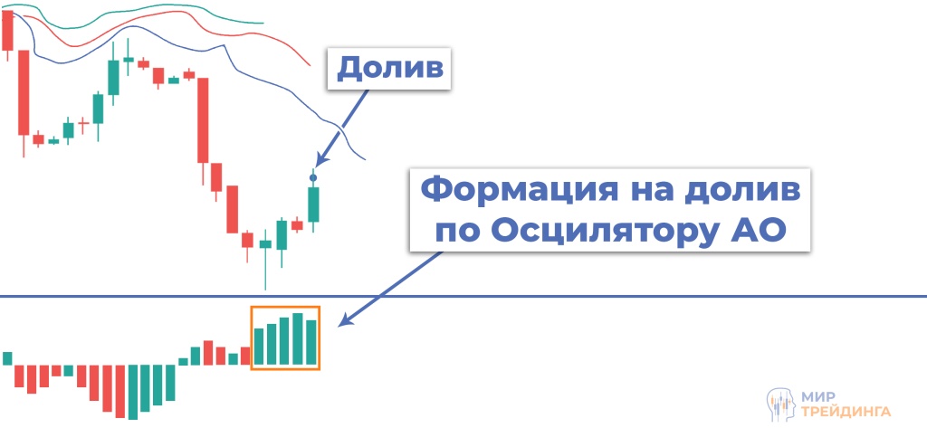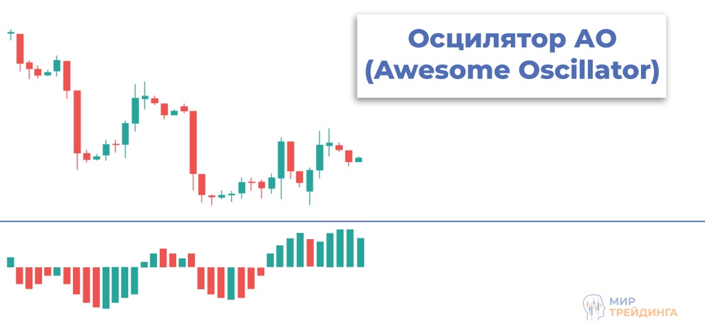 3) Осциллятор АО (Awesome Oscillator) — индикатор помогающий дать подтверждение сформировавшемуся тренду. Состоит из двух скользящих средних: короткая на 5 периодов, длинная на 34 периода. На графике индикатор выглядит как гистограмма с красными и зелеными столбцами и показывает разницу между значениями двух скользящих на каждом из баров.