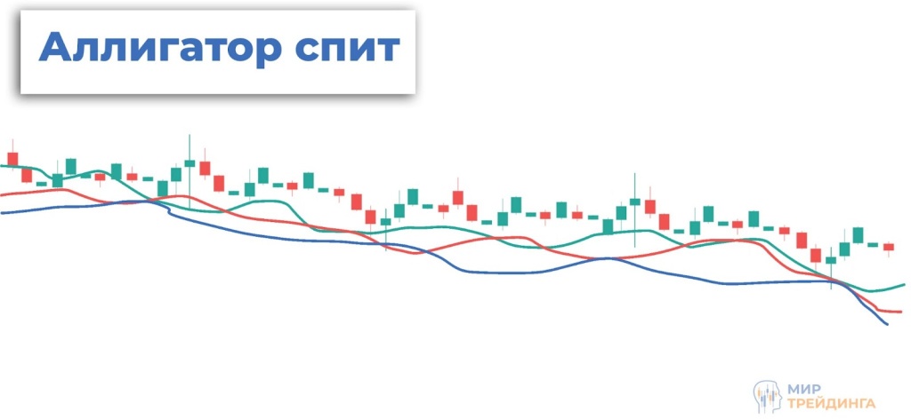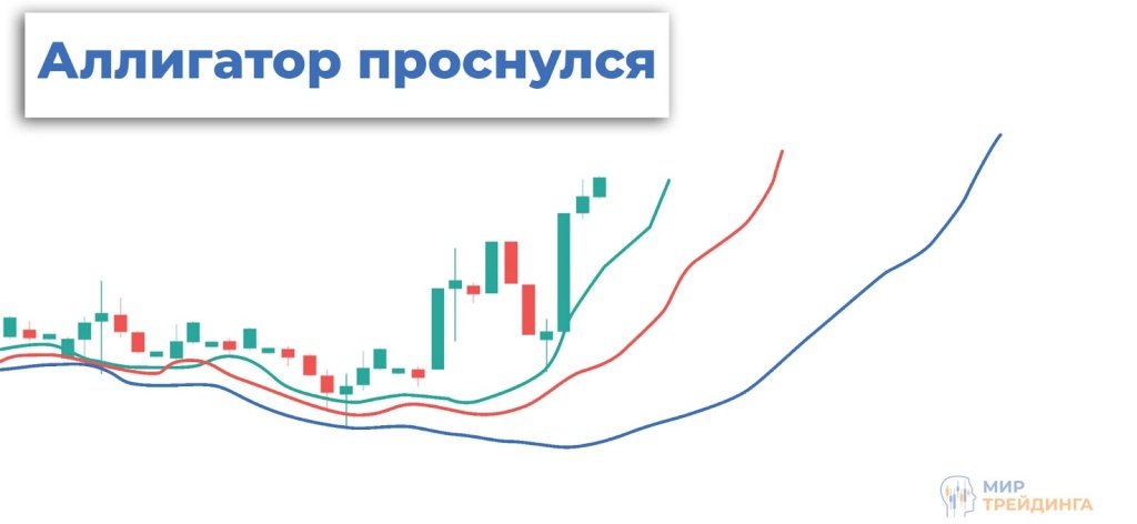 В совокупности все скользящие Аллигатора показывают силу тренда и его направление. Если линии находятся близко друг к другу и переплетаются, на рынке происходит консолидация. Такой сценарий сигнализирует о том, что Аллигатор спит, набирая во время проторговки все больше трейдеров со сделками в шорт и лонг. Чем дольше проторговка, тем сильнее вероятность импульса либо смена тренда в одну из сторон. Когда скользящие начинают движение в одну сторону, при этом отдаляясь друг от друга, это признак зарождения нового тренда. Аллигатор просыпается.