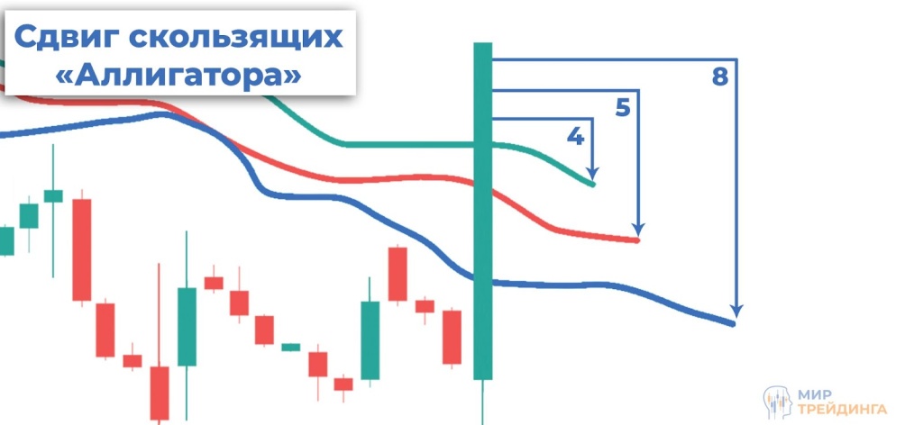 Челюсти аллигатора — синяя линия на 13 периодов и сдвигом на 8 свечей вперед. Челюсти можно считать основной скользящей, так как она показывает потенциальную границу среднесрочного тренда. Эффективна на старших таймфреймах.