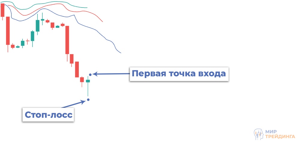 Ожидаем появление разворотного бычьего бара. И только после его подтверждения открываем первую позицию в лонг, устанавливая стоп-лосс за минимум бара.