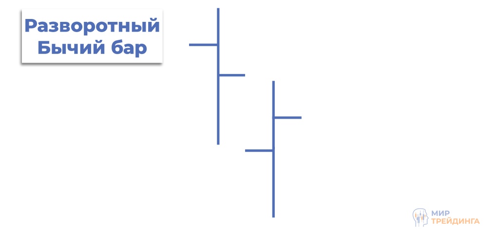 Разворотный бар определяет точку разворота рынка в одну их сторон. Паттерн состоит из одного бара. При развороте в бычий тренд, минимум текущего бара ниже предыдущего, а закрывается он выше своей середины.