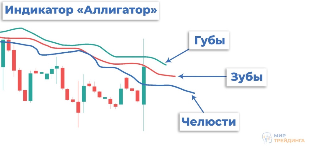 1) Аллигатор - технический индикатор состоящий из трех скользящих линий, которые определяют текущее состояние рынка и тренд. Индикатор получил такое название, потому что каждая из его скользящих в комбинации образует пасть аллигатора.