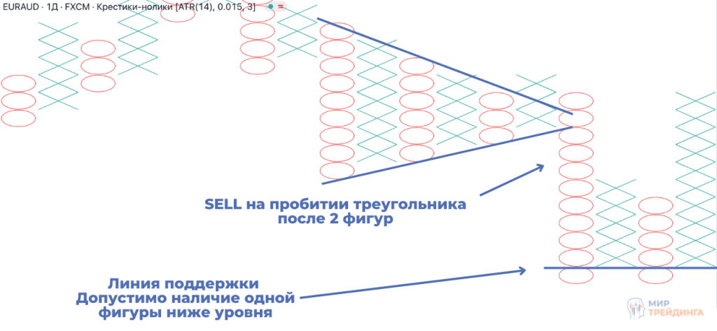 Играть и выигрывать в крестики-нолики трейдеры предпочитают без использования других индикаторов. Первым методом торговли является открытие позиции по ходу движения цены. То есть открываем сделку на покупку после появления первого крестика и сделку на продажу после первого нолика. Но данная стратегия подходит не для всех инструментов и может давать большое количество ложных сигналов. Наиболее надежная торговля основана на стандартных графических паттернах (прямоугольник, двойная вершина, треугольник, голова и плечи, ромб и т.д.), пробоях уровней поддержки/сопротивления. Построение линий осуществляем по краям фигур. В нашем примере пара EUR/AUD на рынке форекс. На графике четко виден паттерн “Сужающийся треугольник”. Открывать сделку при пробое можем после формирования минимум двух фигур за пределами треугольника. На примере можно наблюдать появление двух ноликов при пробитии треугольника. После их формирования смело можно открывать сделку на продажу. Линии поддержки/сопротивления на крестиках-ноликах также строятся очень удобно. При этом допустимо пробитие уровня на одну фигуру. То есть мы торгуем на отскоке и пробое поддержки или сопротивления.