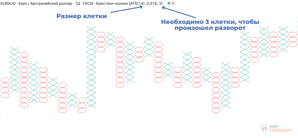 Данный тип графика строится по очень простому принципу. Чередование наглядных восходящих и нисходящих движений. При этом отсутствует фактор времени. Восходящее движение обозначается крестиками, а нисходящее ноликами. На графике не будет два подряд вертикальных столбца с только крестиками или только ноликами. Поле для крестиков-ноликов состоит из одинаковых клеток. В нашем случае клеткой является ценовое движение. В настройках вы сами можете указать, чему будет равно ценовое движение, то есть сколько пунктов должна пройти цена, чтобы был сформирован крестик или нолик. Например, на сайте TradingView эта настройка регулируется с помощью индикатора ATR. Следующим важным параметром для построения является правило смены тенденции. То есть сколько клеток должна пройти цена в обратном направлении, чтобы крестик сменился на нолик или наоборот. Это правило также регулируется в настройках. Также следует знать, что крестики-нолики не учитывает экстремумы. А формирование очередной клетки происходит после закрытия торгового дня.
