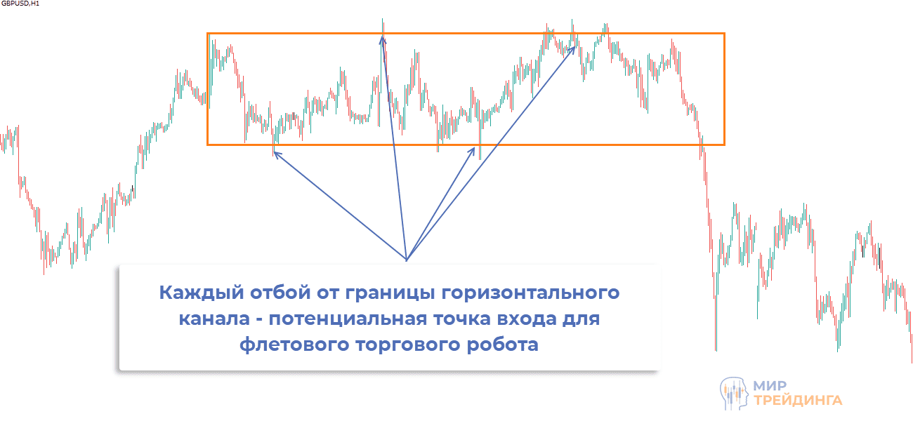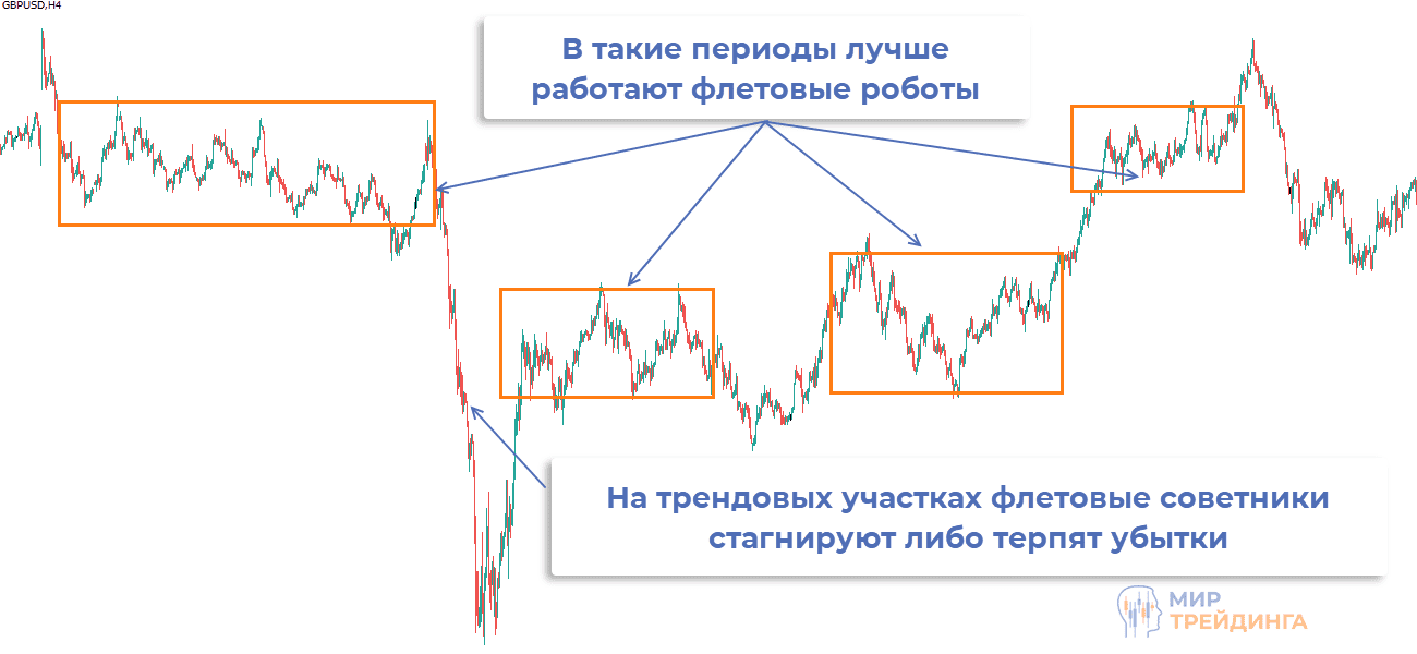 Флет – отсутствие направленного движения, график находится в горизонтальном коридоре. Система предполагает торговлю при отбое от границ этого канала, поэтому флетовые советники можно назвать разворотными. Их цель – сигнал в виде отбоя от поддержки/сопротивления. Если робот использует лучшие стратегии форекса, то профит обеспечен.