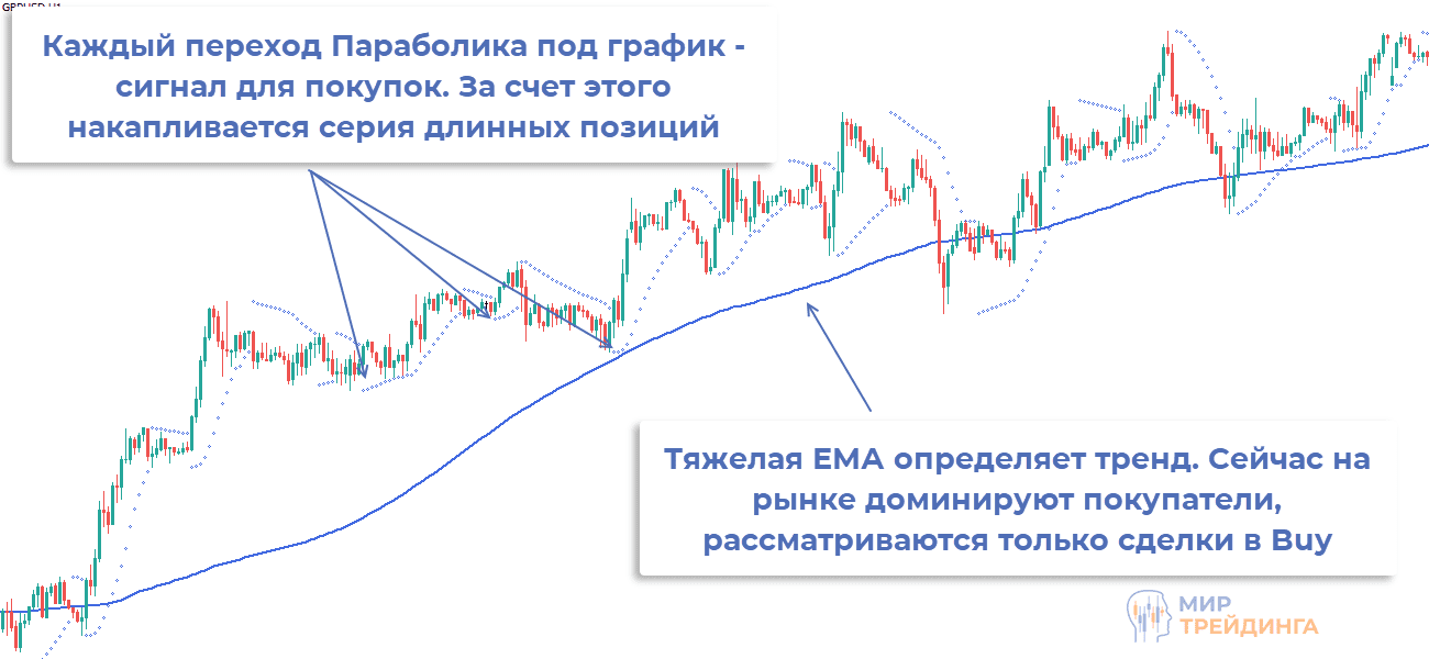 - фильтрация направления торговли по скользящей средней и вход при сигнале от Параболика. Возможен и другой набор индикаторов.
