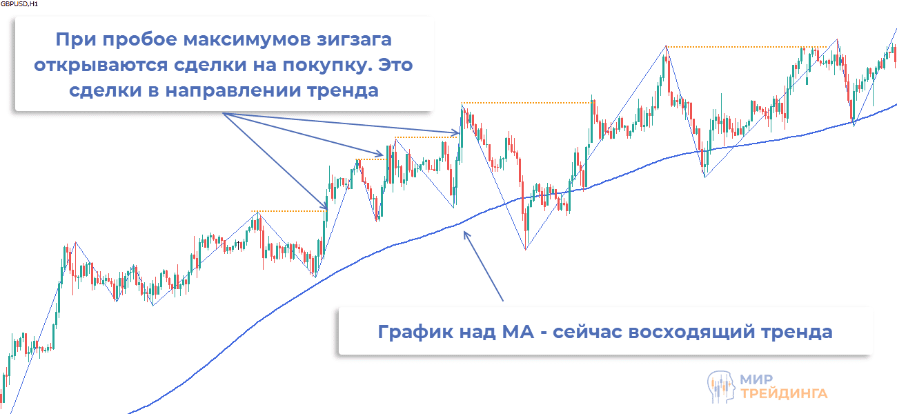 Например, график остается над МА – тренд восходящий. Значит работа будет начитаться при пробое сопротивлений, построенных по максимумам зигзага.