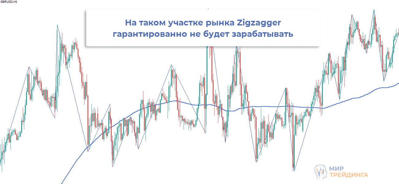 Этот прием отлично работает при направленном движении. Но во флете будут бесконечные убытки либо закрытие сделок с нулевым профитом. Уровни зигзага будут постоянно ложно пробиваться, это «ломает» логику Zigzagger.