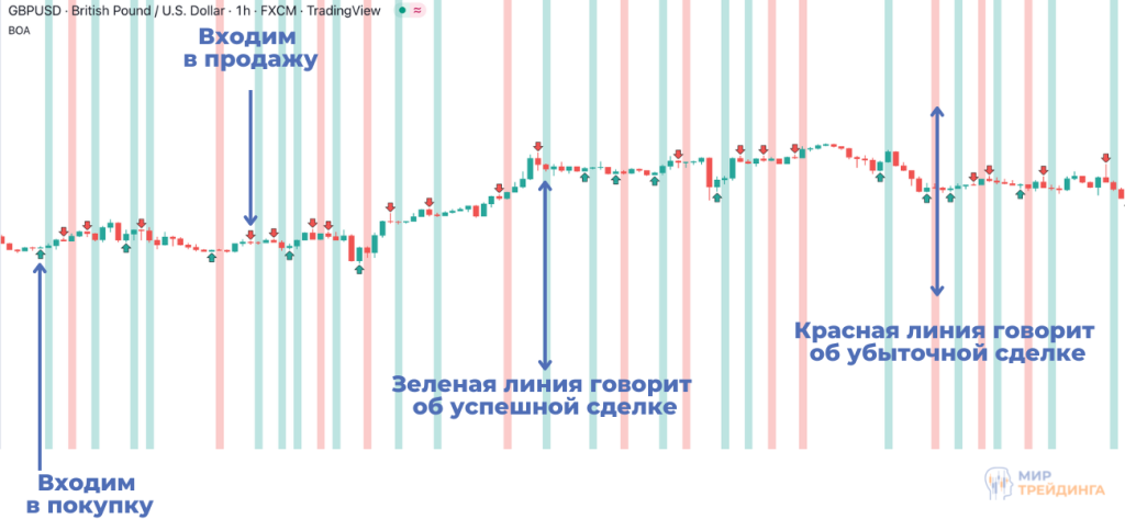 Индикатор основан на распознавании свечной фигуры Харами. Появление зеленой стрелки обозначает, что необходимо входить в покупку. Красная стрелка сигнализирует о продаже. Также индикатор показывает историю сделок. Красная вертикальная линия означает, что индикатор дал ложный сигнал. Зеленая линия свидетельствует о верном сигнале.