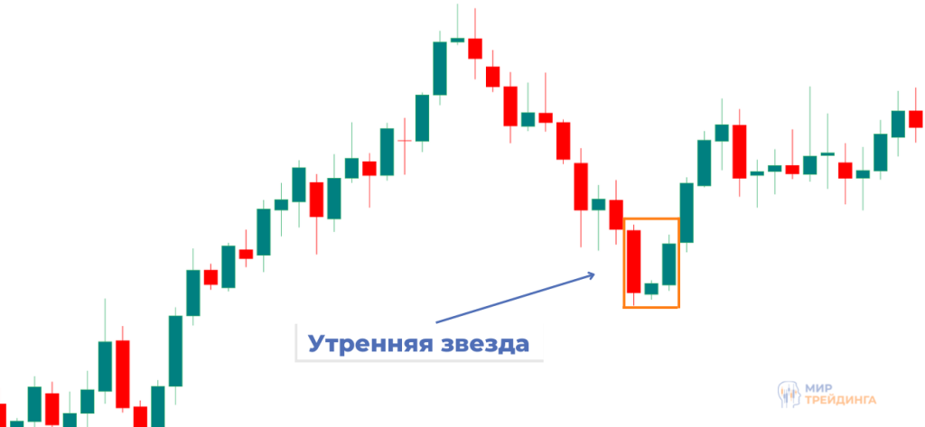 Утренняя звезда – это не самый простой паттерн. Он состоит из трех свечей. Показывает равномерный разворот с формированием дна. Обычно представляется в виде медвежьей свечи с большим телом. После неё происходит пауза с формированием очень маленькой по диапазону свечи. Завершается модель бычьей свечой с телом, сопоставимым с телом первой свечи. Модель считается надежной. К тому же большее количество свечей позволяет получить подтверждение на индикаторе. Например, на осцилляторе MACDили Stochastic.