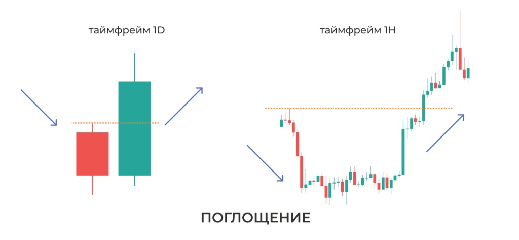 Наиболее эффективным вариантом можно считать поглощение, которое происходит с обновлением минимума и закрытием выше максимума первой свечи. Это означает, что покупатели активизировались и далее вероятно продолжение роста;