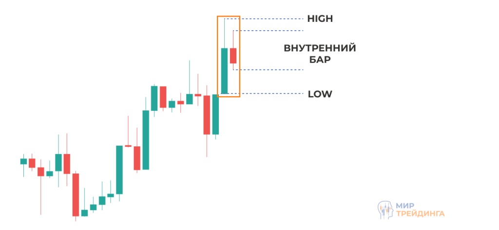 Этот паттерн состоит из двух свечей. На растущем/падающем тренде образуется большая свеча по направлению движения. Следующая формируется в противоположную сторону и попадает в диапазон предыдущей. Т.е. High и Low последней свечи не пересекают High и Low предыдущей – вторая значительно меньше первой.