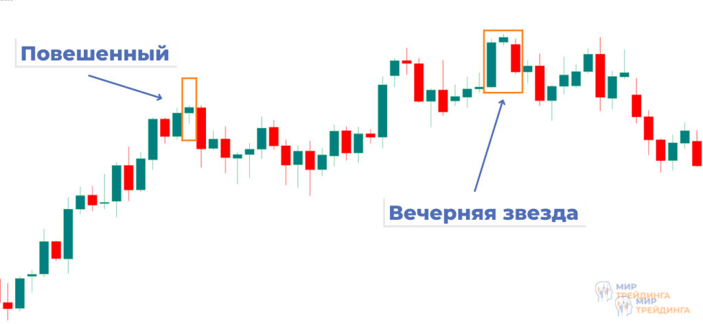 Такие модели завершают бычий тренд и формируют разворот вниз. Они полностью идентичны бычьим моделям. Просто направлены в другую сторону и имеют иные названия. Дадим краткие описания и покажем каждую из свечных комбинаций.