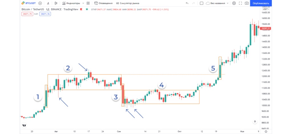 Тут происходило распределение актива. Это видно по длинным свечам сверху и большим медвежьим свечам;