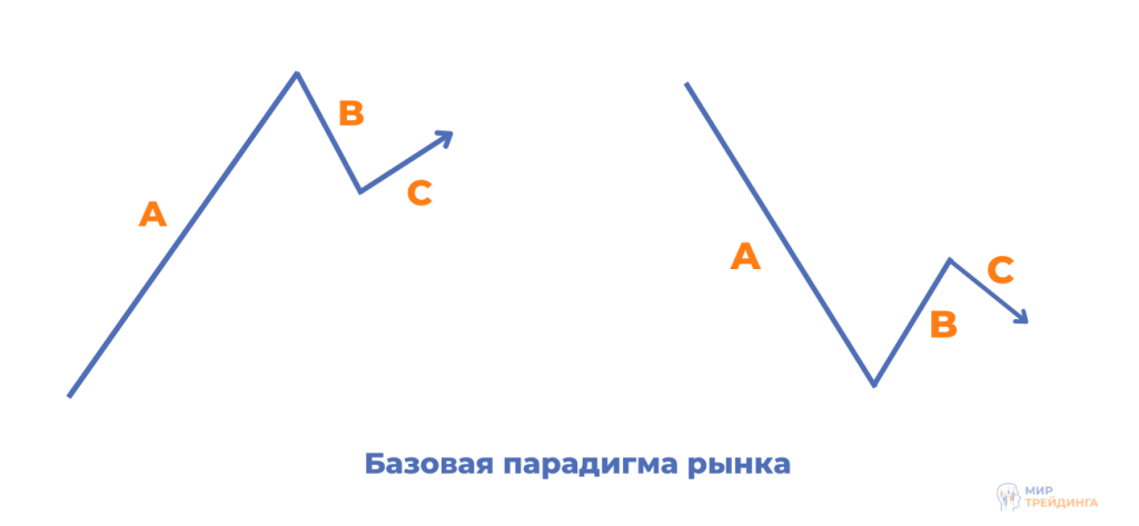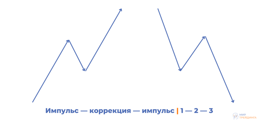 Согласно базовой рыночной парадигме, любое трендовое движение цены, как вверх так и вниз, развивается по схеме импульс-коррекция-импульс. При нисходящем тренде импульс исходит от продавцов, медведей. Затем вступают в игру покупатели-быки, и происходит коррекция, за которой снова следует импульс продаж. И наоборот, в восходящем тренде сначала идет импульс покупок, за ним коррекция со стороны продавцов и снова импульс покупок. В боковом движении происходит то же самое. Только микротренды возникают на младших таймфреймах, и ни одна из сторон не может вывести цену из канала в своем направлении.