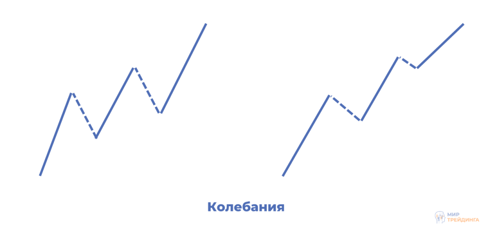 В волновой теории Гудмана, колебанием или свингом называется непрерывное движение цены более чем на 25%. Движение менее чем на 25% не считается самостоятельным колебанием. Коррекции нет, пока не сформируется полноценное колебание в обратном направлении.