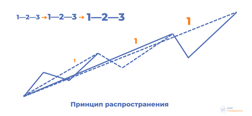 В данном базовом сетапе используются принцип матрицы импульс-коррекция-импульс, принцип распространения и принцип пересечения. Самым важным здесь является принцип распространения, через призму которого следует рассматривать все графики.