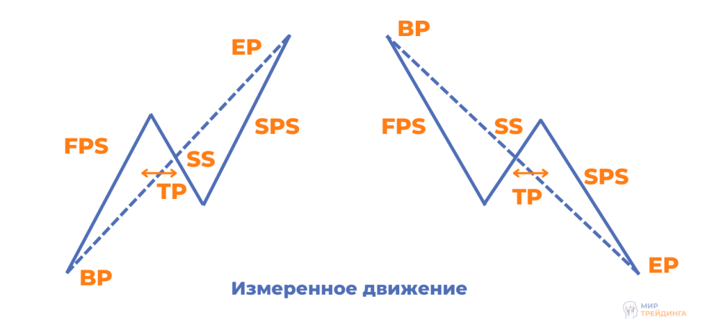 Точка перелома TP служит важной точкой равновесия. Здесь в точке 50% все покупатели и продавцы, участвующие в данном движении, равны. То есть половина покупателей (купившие в начале движения) и половина продавцов (продашие в конце движения) получают прибыль. И наоборот, половина покупателей (купившие в верхней точке) и половина продавцов (продавшие в нижней точке) — получают убыток.